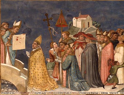 • Nel 1263, mentre un sacerdote boemo celebrava la messa a Bolsena, gocce di sangue scesero dall’ostia e andarono a bagnare il corporale. Papa Urbano IV, conosciuto l’episodio miracoloso, fece trasportare il Sacro Lino nella città di Orvieto, dove, l’anno seguente, con la bolla Transiturus, istituì la festa del Corpus Domini.