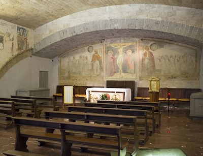 - Gli affreschi tuttora esistenti raffigurano due sante ed una suggestiva Annunciazione della seconda metà del XIV secolo; di fronte all’ingresso, si trova la Crocifissione di Cola Petruccioli, commissionata da un tale Savinus Vannutii nel 1380. Vi è rappresentato il Cristo assistito da san Giovanni e dalla Madonna. Ai lati sono raffigurati san Costanzo e san Brizio con dei confratelli in preghiera.