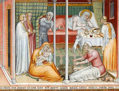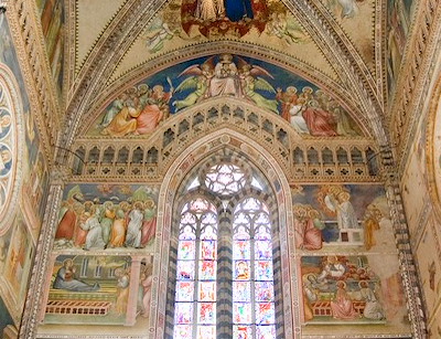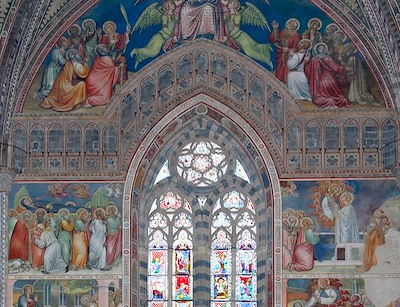 La grande vetrata della tribuna, realizzata nel XIV secolo da Giovanni di Bonino da Assisi, è un vero capolavoro dell’arte gotica. È divisa in 44 riquadri rettangolari, rappresentanti episodi della vita di Maria.