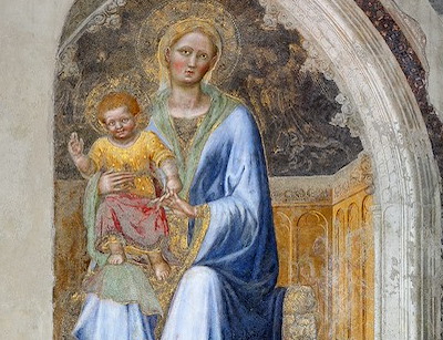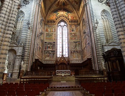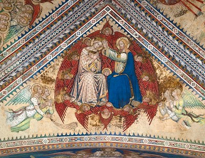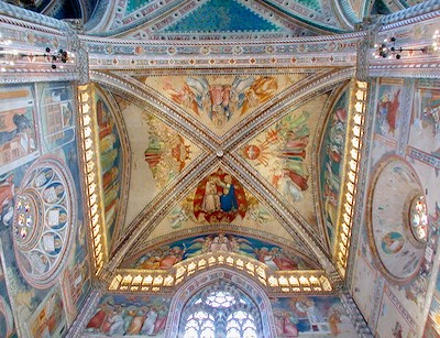 Il ciclo pittorico dell’abside ha per tema la Vergine Maria, così come raccontata nei Vangeli. Alle pareti sono rappresentati Episodi della vita della Vergine e, nella volta, la sua incoronazione. I dipinti sono stati eseguiti da Ugolino di Prete Ilario ed aiuti sul finire del Trecento e subirono un importante intervento di restauro verso la fine del Quattrocento ad opera di Giacomo da Bologna, di Bernardino di Betto detto il Pinturicchio e di Antonio da Viterbo detto il Pastura.