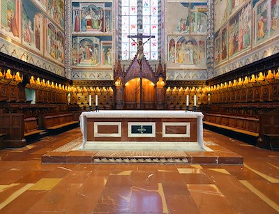 Intagliato ed intarsiato da Giovanni Ammannati da Siena e aiuti nel XIV secolo, viene rifatto, sul modello originario, nel XX secolo. È formato da tre ordini di seggi che includono, nella parte centrale, la cattedra episcopale. Alcune porzioni dell’originale sono oggi conservate nel Museo dell’Opera del Duomo.