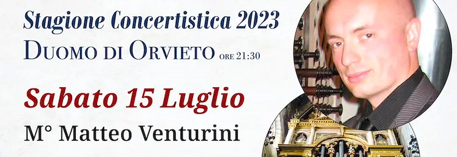 Dopo l’annullamento per motivi personali e l’attesa per la riprogrammazione del concerto del maestro Claudio Brizi, dello scorso 8 luglio, continua la stagione di concerti d’organo “in Opera Musica” promossa dall’Opera del Duomo di Orvieto. Sabato 15 luglio 2023 alle ore 21: 30 al Duomo di Orvieto, l’organo della cattedrale orvietana sarà affidato alle mani del maestro Matteo Venturini, organista titolare della Cattedrale di San Miniato – Pisa .